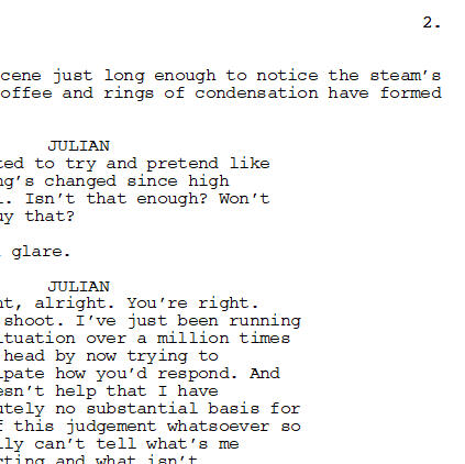 A sample of prose taken from a dramatic screenplay about the failure of two old friends failing to reconnect. 4 pages.