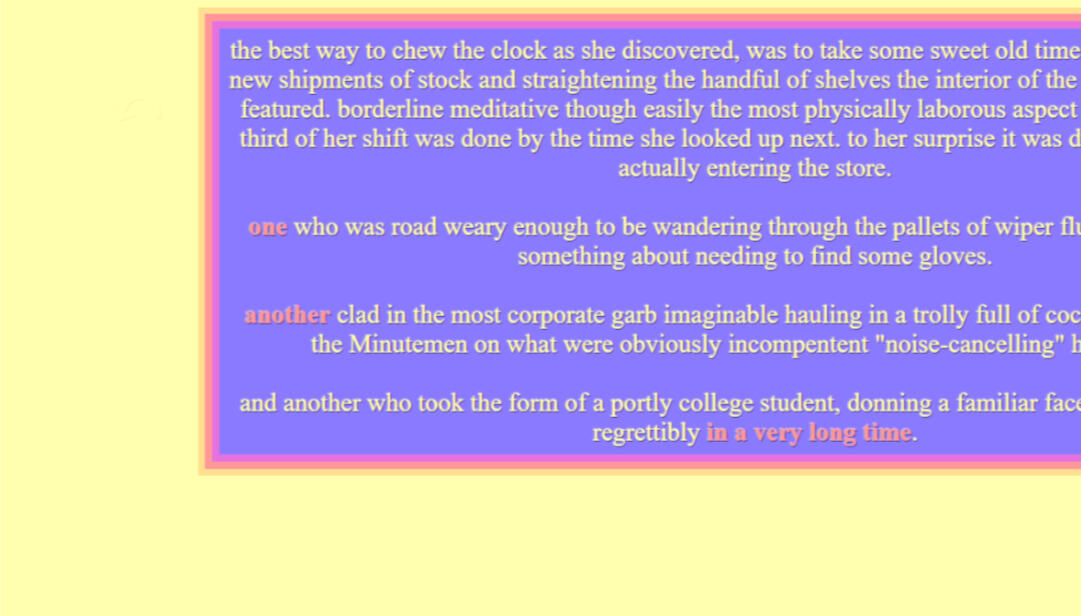 Sitting at a total of ninety two scenes and with three unique endings, a completionist playthrough of It Doesn’t Have to be Like This takes around an hour. A lot of my early work exist as various kinds of mood pieces that take a sincere look at how collectivism and autonomous self actualization can coexist and conceptualizing It Doesn’t Have to be Like This began no differently. The further I begun the outlining of the plot, the way certain characters behaved became defined & crafting the narrative profluence (the order of which scenes should be presented in their respective medium) became clear. To this day, it remains as one of my favorite projects I’ve worked on.
