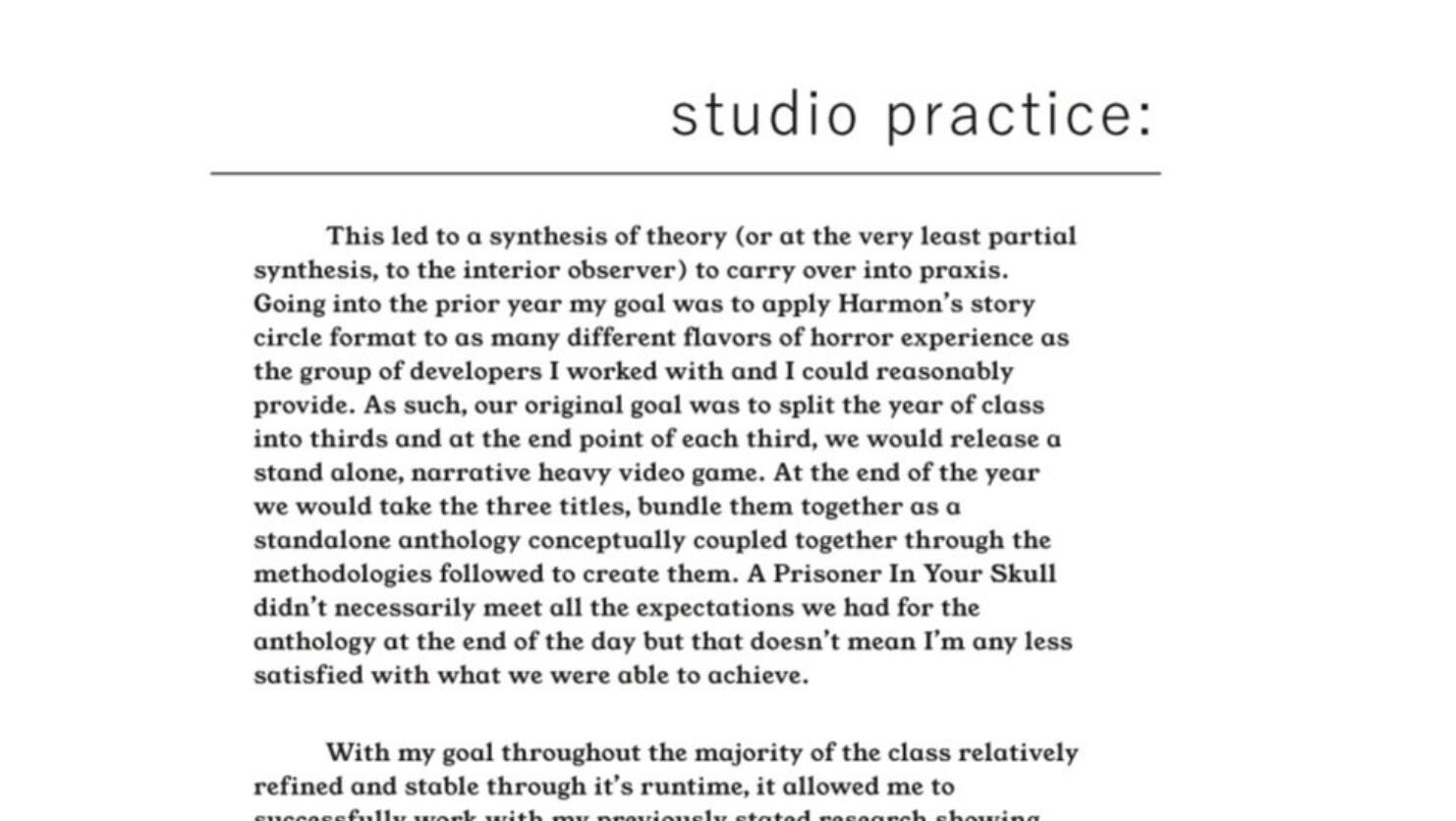 Sublimated, as a project, began at the end of my undergraduate degree and was originally meant to be included in the A Prisoner In Your Skull thesis bundle as the third narrative title, but was replaced by the networked online multiplayer showcase and began to take on a life of it's own as I entered my graduate program. I percolated on world building documents and character sketches intermittently over the course of two to three years until my final twenty weeks of the Master's degree where I devoted my capstone project to turning Sublimated into an eighty page feature. Thematically, it's a slasher movie about our capacity for processing grief and the limitations of the protestant work ethic. It's logline is, "When a local summer camp comes under attack by mysterious oil covered creatures, a counselor and her coworkers must find the now missing owner of the camp before they bite the dust themselves."