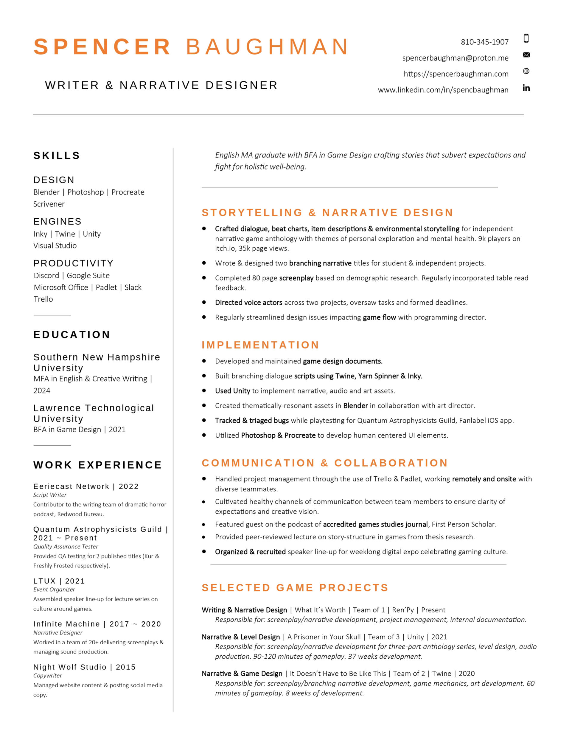 Hello! I am a Writer & Narrative Designer and recent graduate with my MFA in Screenwriting from Southern New Hampshire University. My work consists of seven published titles, a short film and a feature length screenplay that explore struggles with mental health.